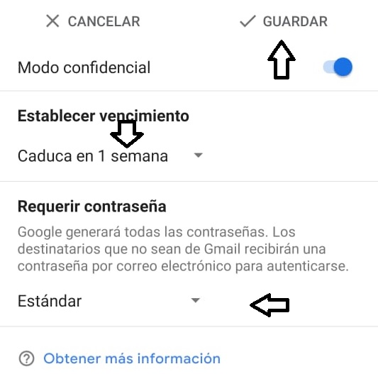 Seleccionar la fecha de vencimiento de la destrucción del correo. De requerir alguna contraseña dirigirse donde dice estándar y modificar las opciones del mismo.