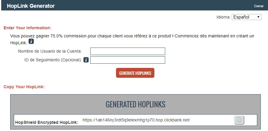 Luego que hace clic en promocionar se abrirá una ventana semejante a la imagen donde se va generar el link de afiliado que va utilizar para realizar su campaña de marketing para inducir que las personas conozcan el producto y así se genere la venta. Ponga su nombre de usuario en el primer cuadrito y luego haga clic en crear.